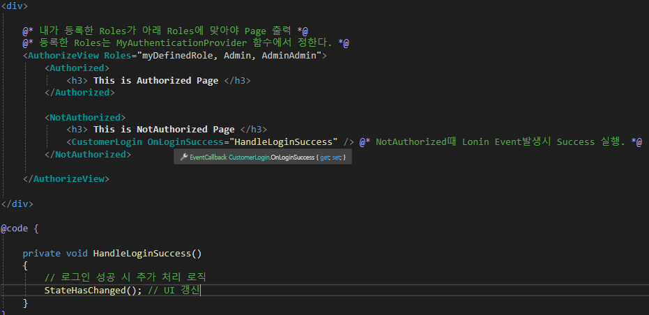 <CustomerLogin OnLoginSuccess="HandleLoginSuccess" /> @* NotAuthorized때 Lonin Event발생시 Success 실행. *@