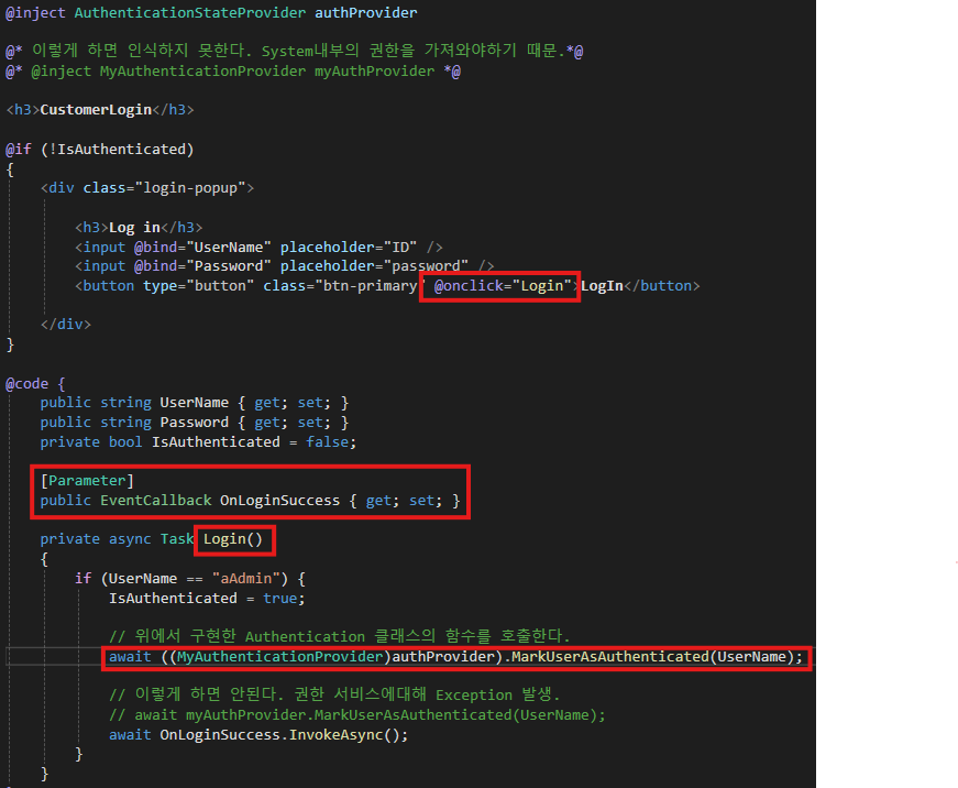public EventCallback OnLoginSuccess는 다른 컴포넌트에서 CustomLogin.razor를 사용할때 행동을 지정하기 위해
