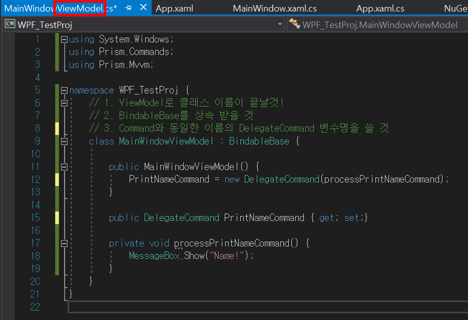 2. Command 이름을 property로 하여 DelegateCommand로 이벤트 정의해주고